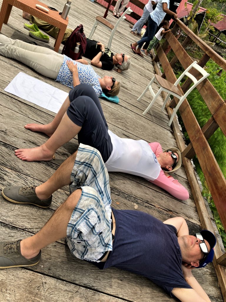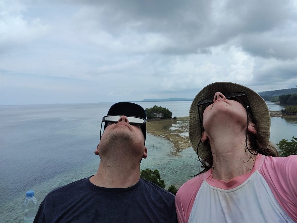 While we waited we had amazing views of the sea and of the local folks fishing for their daily meal off the beach below us. Lion had brought lunch and beers for us, so we were pretty comfortable. As the partial began and the eclipse progressed we alternated between looking out at the view, checking the moon’s progress with our eclipse glasses, enjoying the puffy clouds and occasional rainbow-looking rings around the sun, and chatting with our fellow eclipse-viewers. We were joined on the wooden platform by a handful of locals, as well as a couple from Amsterdam who had been scuba diving in Raja Ampat and added Biak onto their trip for the eclipse, and an amateur astronomer, Mike, who had flown all the way from New York just to be in Biak for the eclipse! As you can imagine, Mike was INCREDIBLY EXCITED about the eclipse, and his enthusiasm was infectious. You can check out videos of the Biak eclipse, as well as some of the 13 other eclipses Mike has seen at his YouTube channel: www.youtube.com/mikekentrianakis