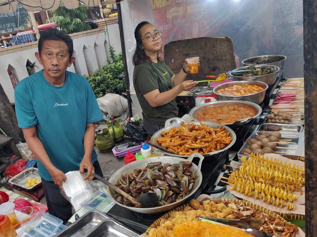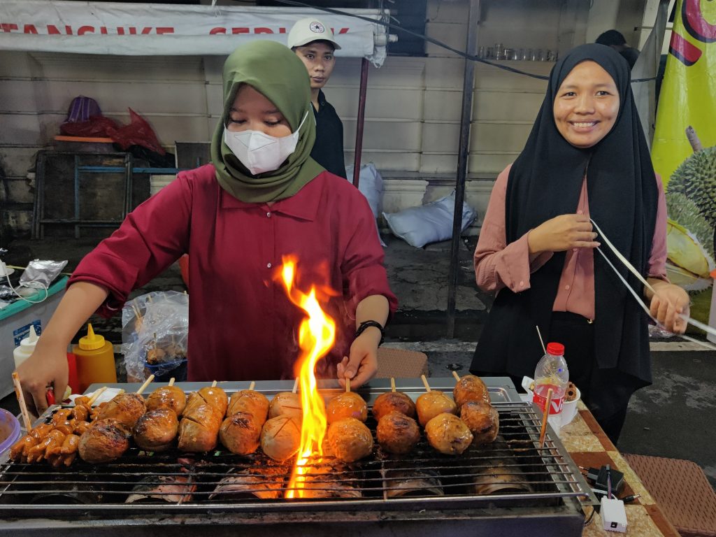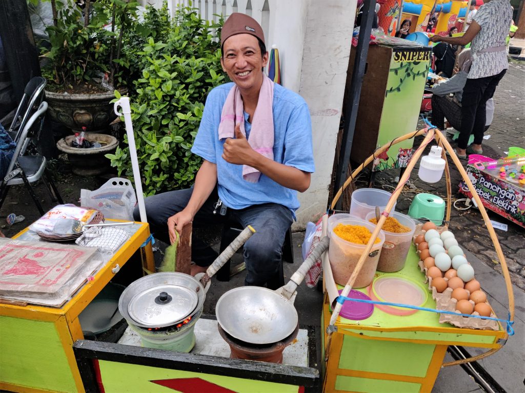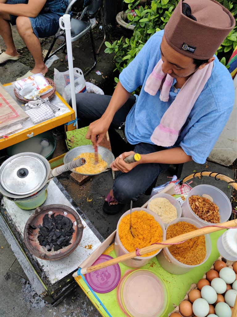 We also tried kerak telor for the first time. We had seen guys sitting behind little stoves with some eggs and toppings and were curious about it. So, when someone ordered one from a vendor, we watched as he made it. It seemed pretty safe, and we ordered one to share. First, in a shallow pan over a small charcoal burner, he cooked some rice that had been soaking in water. Then, he added egg to it, plus some toppings. We asked about the toppings, thinking maybe they were beef floss (a popular ingredient in Indonesia). We were happy to hear they were just fried shallots and coconut! After cooking the bottom, he turned the pan upside-down on the burner and cooked the top. The last step was to slide it out onto a piece of paper, add some more toppings, and roll it up. It was delicious! I would order it again another time.