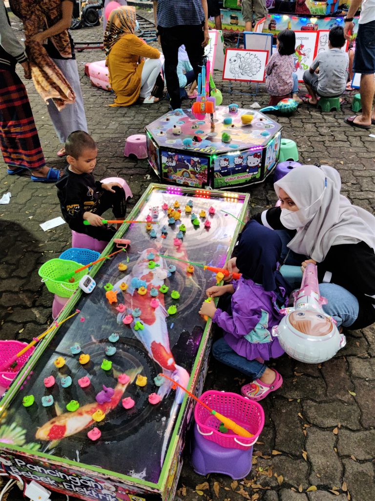 The street is pretty crowded, so there were a lot of people in a small space. There was a huge variety of food stalls, plus a stand selling goldfish from a kiddie pool, and various games and activities for kids in the area in front of the mosque. It was a great atmosphere, with families out having fun, enjoying the music, and hanging out with neighbors.