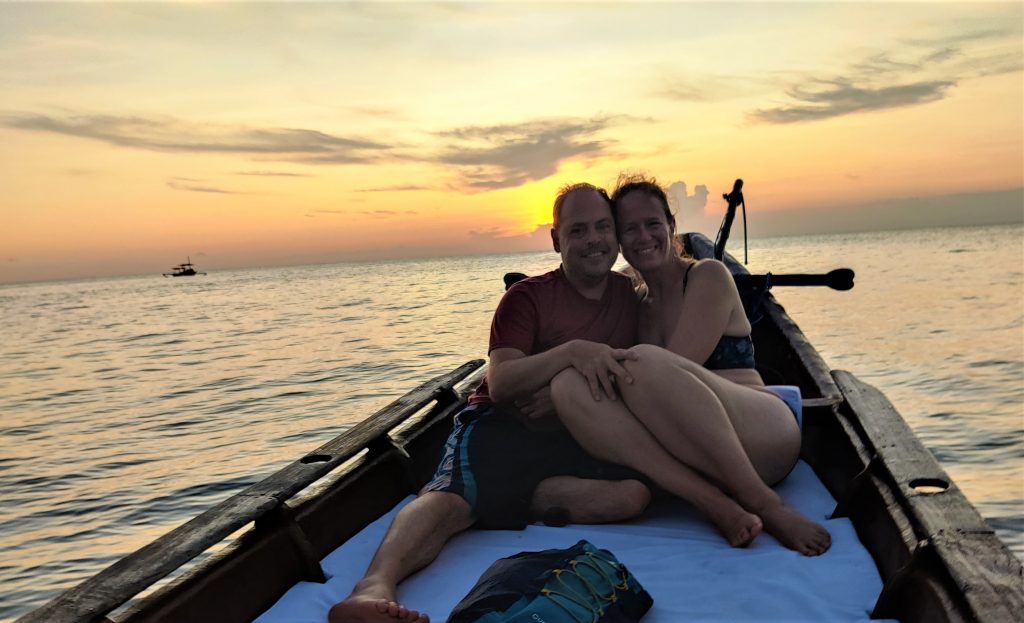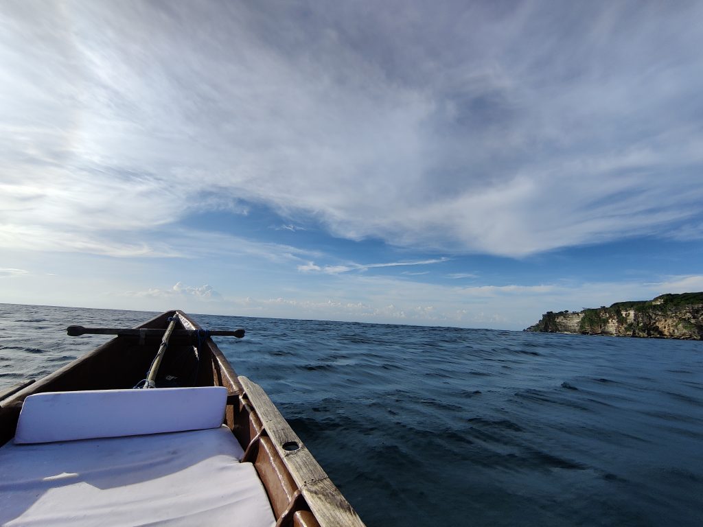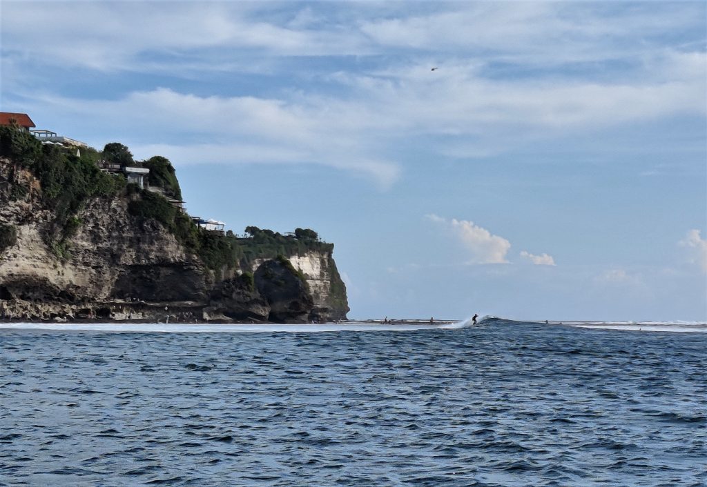 We did find a fish restaurant, and had a great meal of fried fish with sambal and veggies, all while sitting with our feet in the sand. We also booked in a sunset cruise in a traditional-style fishing boat with the Black Pearl. We sailed out past the amazing cliffs of Uluwatu and watched surfers catching waves.