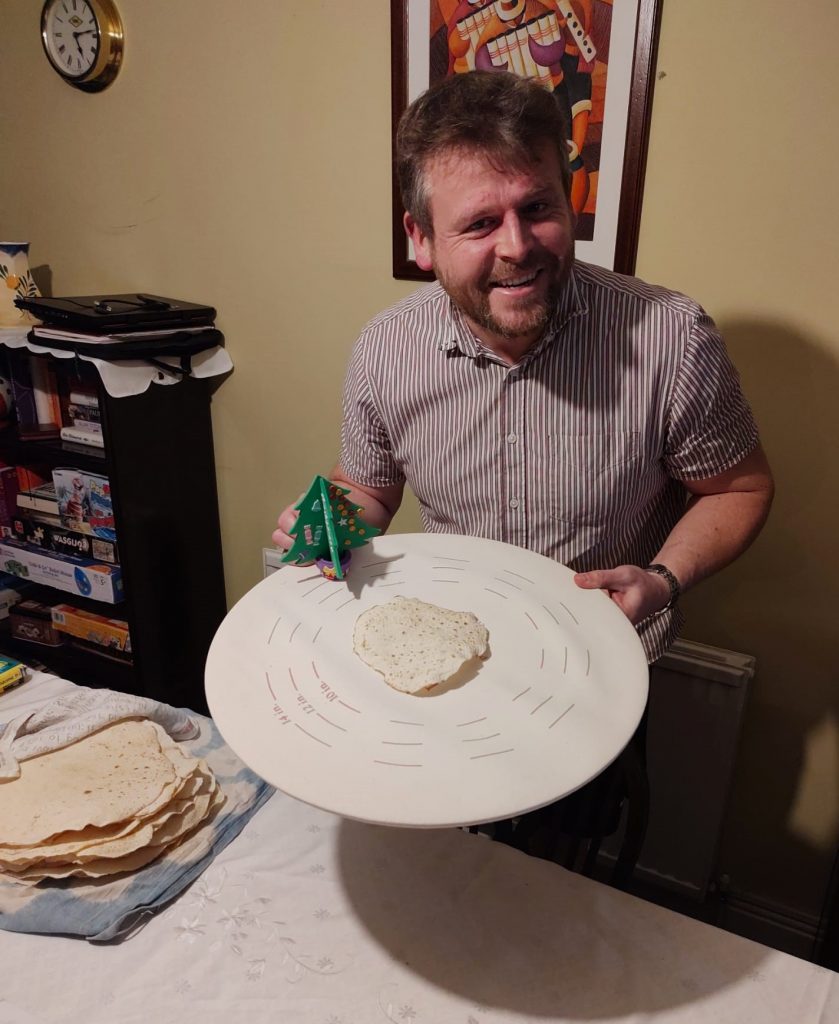 Angie’s family has a lot of Christmas traditions that are part of their grandparents’ Norwegian immigrant legacy. One of them is that we always have lefse dinner for Christmas Eve, so making lefse, as well as kringla, is a tradition that everyone helps out with.