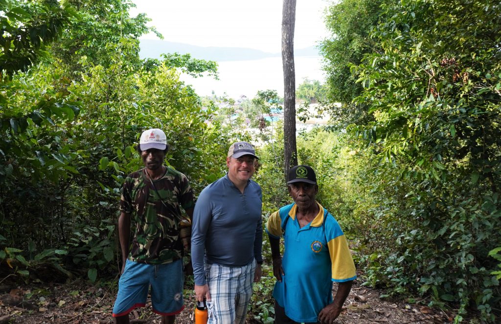 The other thing that Raja Ampat is known for is birds of paradise – the birds, not the flower. We took the opportunity one morning to view the crimson bird of paradise. It lives on the island where the resort is located. To get there, we left the resort about an hour before dawn and took a short boat ride to the nearby village. There, we met our guide, an older villager. He and another man walked us up into the forest above the village. We walked about a half hour to a spot in the forest where the village has set up some rudimentary benches. We sat in the darkness listening to a cacophony of bird calls as the sky slowly got lighter. Eventually, a tree overhead took shape, and at some point 7-8 crimson birds of paradise flew in. There was at least one male, and a bunch of females. Of course, we don’t yet have binoculars, and they were up in the trees, so our view was limited. But we could see enough to understand that the male was doing his mating dance. We saw the long plumes from the male’s tail and his wings and body moving around in the dance. We sat and watched the birds, just in awe. It was so cool! We were very lucky. Eventually, our guide said, “It’s 7:00.” And it was time to go. The birds actually never flew away – we just left them in the forest as we made our way back to the village.