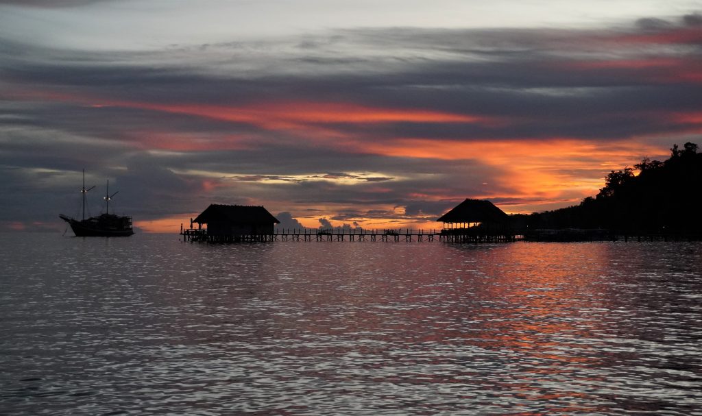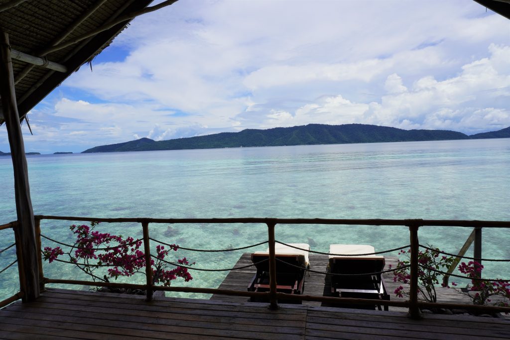 We flew direct from Jakarta to Sorong and then took a boat about two hours from Sorong to the resort. We were delighted with our bungalow (pondok in Indonesian). It is built in traditional local style out over the water by people from the nearby village. One of the best aspects of the resort was the hammock on a covered part of the deck, and a second section with lounge chairs where we spent each night stargazing.