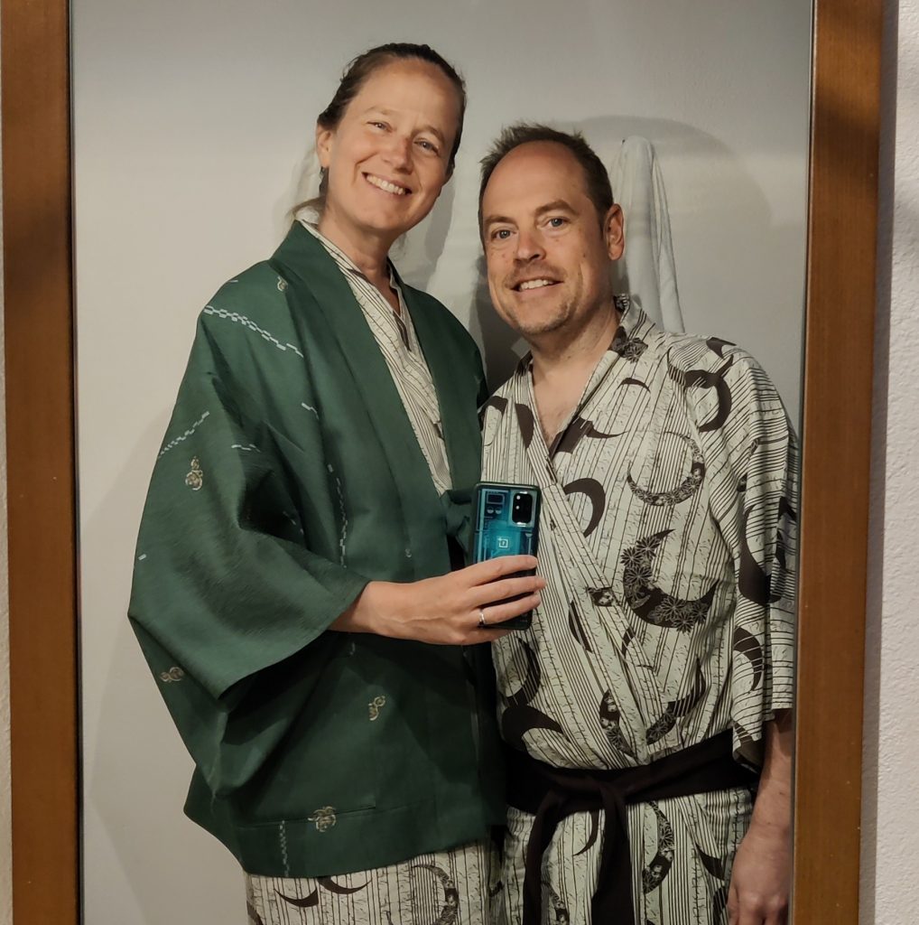 Right away the first afternoon, we decided to check out the onsen. There are separate men’s and women’s onsens, and they switch location twice a day so that everyone can enjoy all the springs. To use the onsen, you go into the changing area and take off your clothes, then you enter the bathing area and first shower yourself thoroughly so that you are fully clean when you enter the baths. The baths were various temperatures, and at this hotel we discovered the luxuriousness of soaking away the day’s aches and pains. This hotel has outdoor onsens with the indoor ones. The outdoor onsens were our favorite. It was so beautiful to sit outside with nature around you in the cool mountain air while you soaked in a hot bath! We took 2 baths a day to really take advantage of our stay. We were in heaven! When you finish your bath, you then put on a yukata, a type of robe, to return to your room.