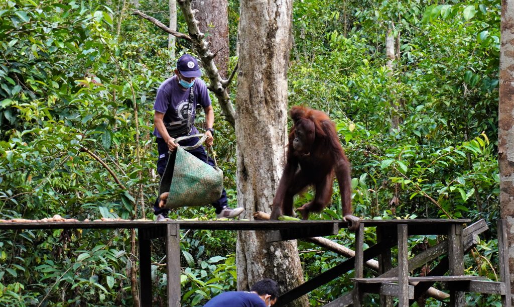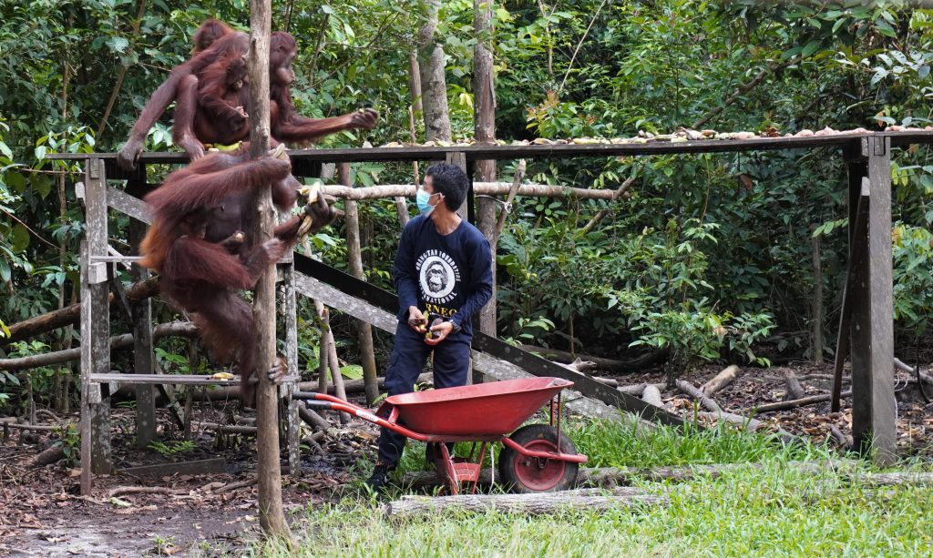One of the rangers at Camp Leakey feeding station. The orangutans got pretty close to the rangers!