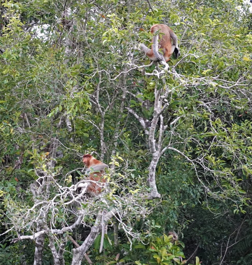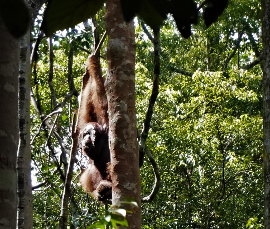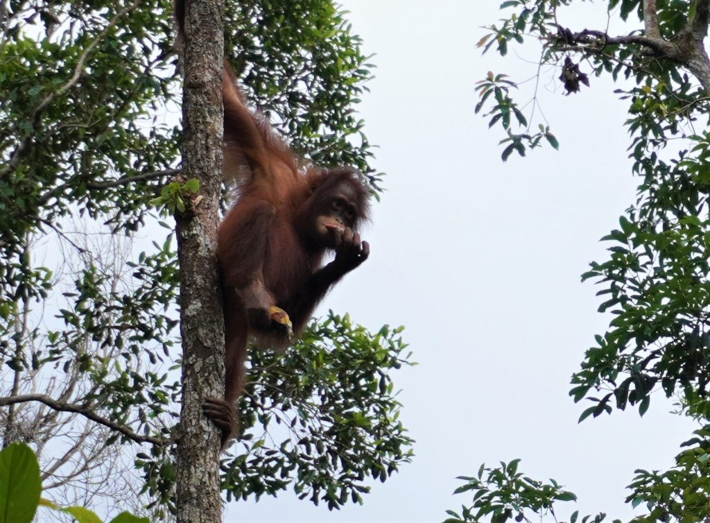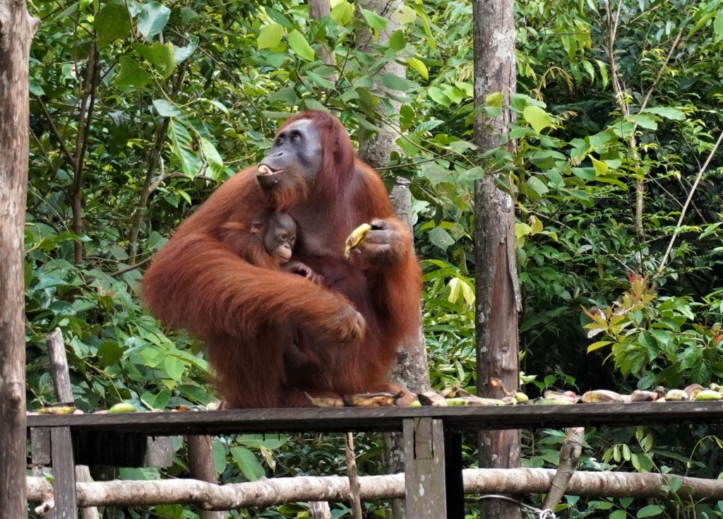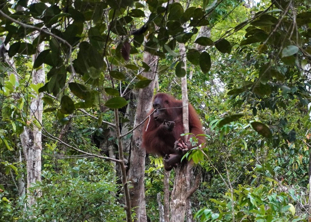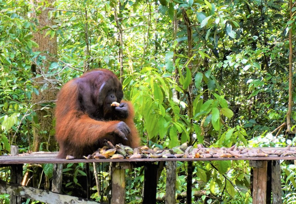 The big attraction of this trip is the orangutans. The park is known for reintroducing orangutans that have been illegally trafficked back into the wild. To support these released animals, they have feeding stations in various locations to supplement the apes’ own harvest from the forest. Feeding takes place at set times of day, and there are areas nearby where tourists can gather to watch the orangutans come down out of the trees to eat. We went to three feeding stations, and saw well over 30 orangutans in total. It was pretty cool. Mostly there were moms with babies, but we also saw a number of teenagers, plus a couple of the “kings” as our guide called them. Those are the dominant males.