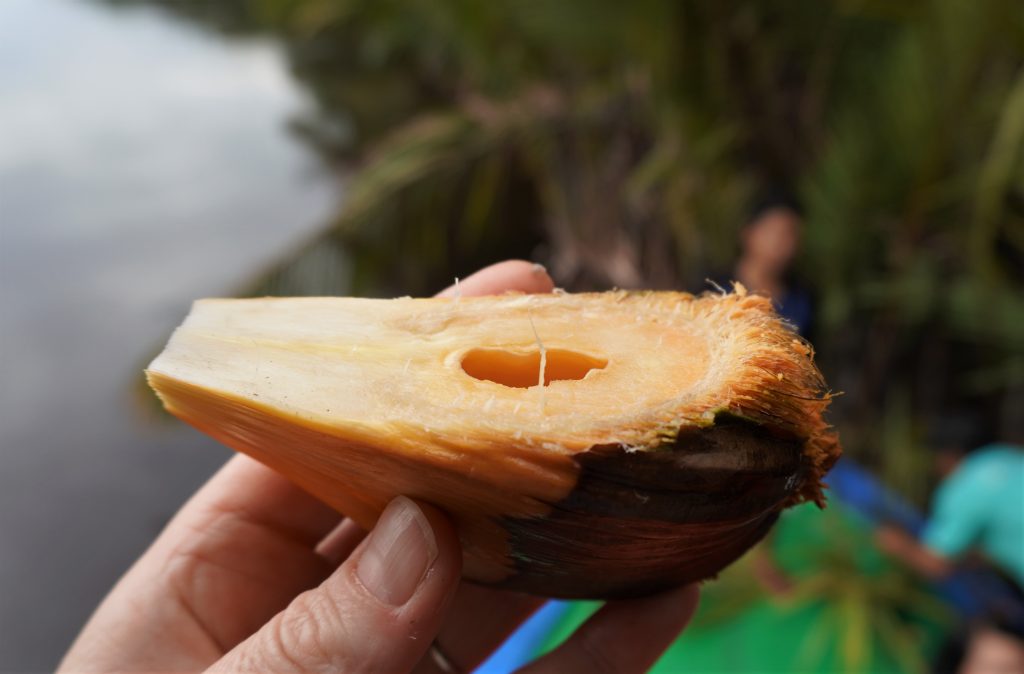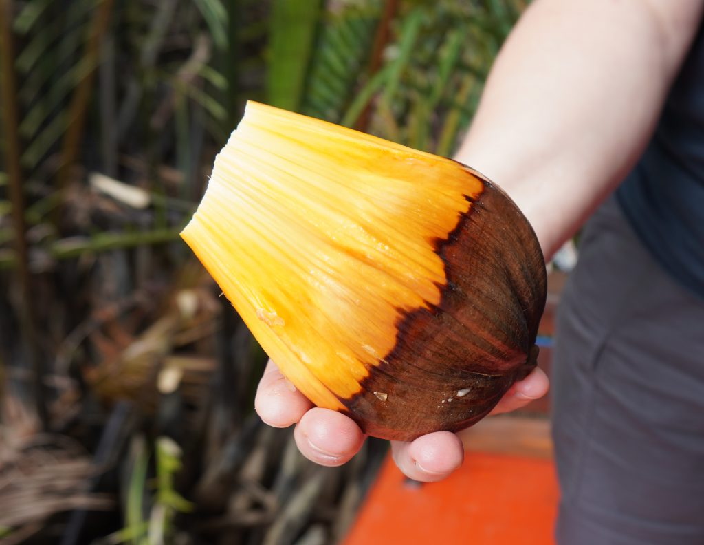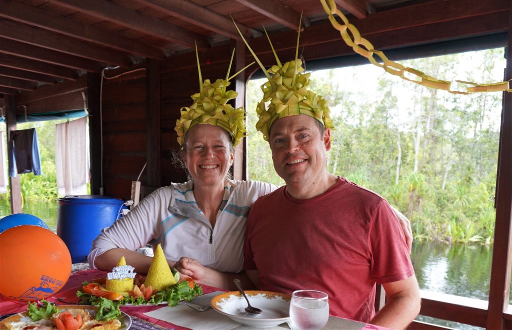 Adam’s birthday was the last day of the trip, so the crew decided to throw a party for him during lunch the day before. They harvested a giant shoot of a type of large grass or palm growing along the river, and used strips of it to make crowns for us all, and garlands for the table. The plant they got the shoot from also produces a fruit that is kind of like coconut. They split it open and we got to try the milk and fruit which was, indeed, similar to cocount!