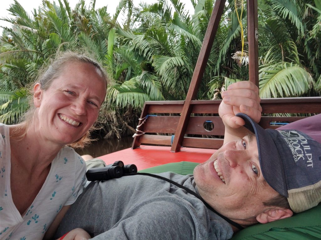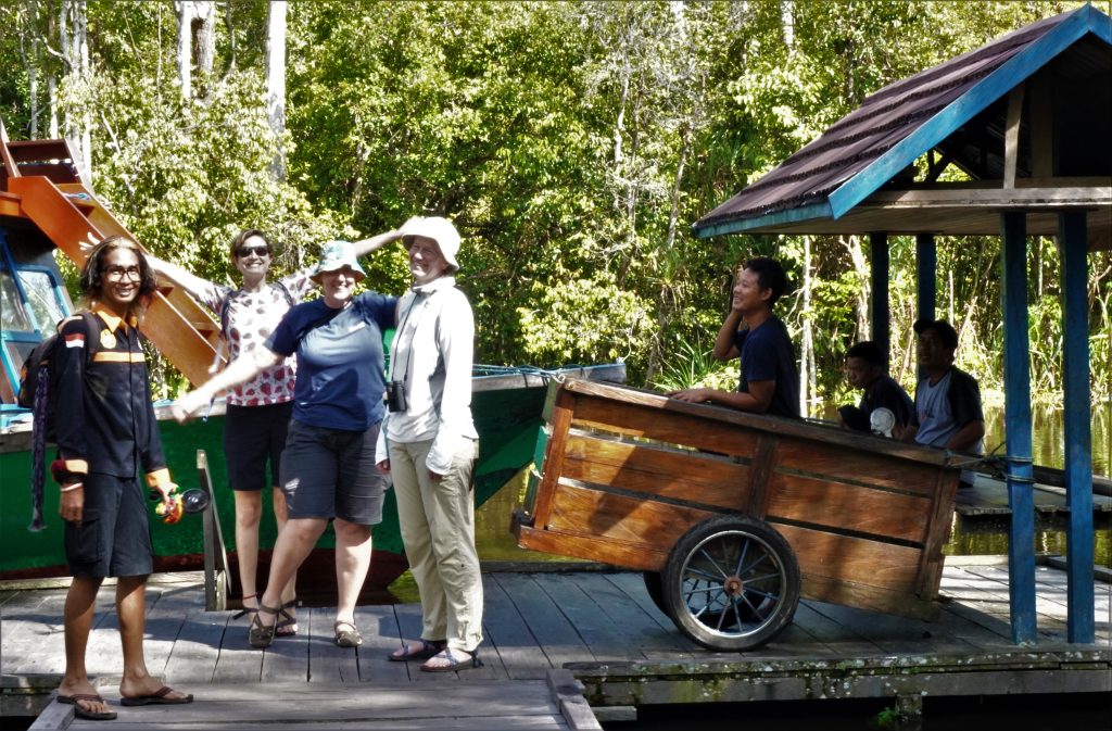 We flew into Pangkalan Bun with our friends Carla and Joyce and were met at the airport by the Orangutan Applause tour company representative. They took us by taxi to the port, and we got on the boat where we’d stay for the next 2 nights. Our boat crew consisted of an English-speaking guide, a captain and his helper, plus a cook.