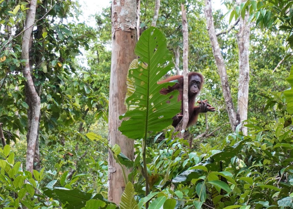 One of the funniest things about watching the orangutans at the feeding station was the mannerisms of the individual apes. Often, one of them would come down to the feeding station and eat for a while, but then it would pick up as many fruits or sweet potatoes as it could carry in its hands, feet, and mouth, and climb back up into the trees to eat. It was so funny watching them struggle to climb up with bunches of sweet potatoes sticking out of their mouths and falling from their fingers and toes!