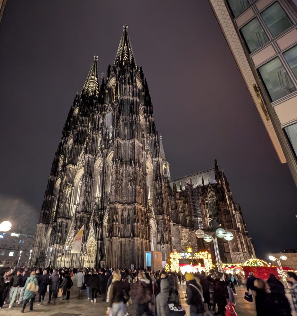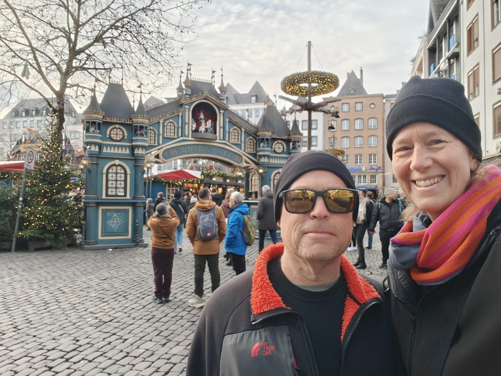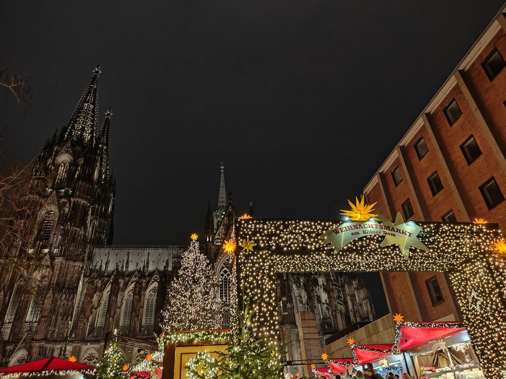 This year for Christmas we decided to head back to England to see Angie’s sister and family. Since their house was being renovated, we only spent the immediate time around Christmas Day and New Year’s with them. The rest of our holiday we traveled elsewhere in Europe, including a quick stop in Cologne at the start of the break. Cologne was a fantastic place to spend a couple of days. The many Christmas markets were so fun to explore! Each one has its own vibe, and we had a blast hanging out in them and enjoying local delicacies with sips of hot wine when we needed to warm up.