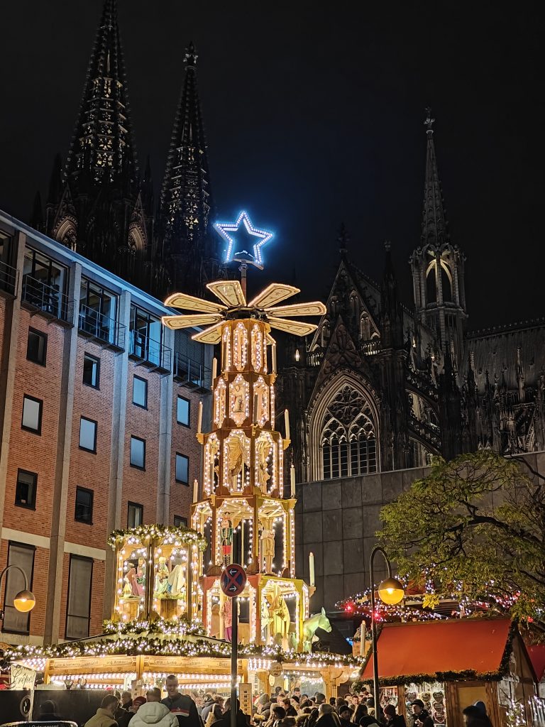 Cologne in the evening was all lit up with Christmas lights, so it was a wonderland to wander back through the city towards our hotel. The market at the side of the cathedral was especially beautifully lit, and on a little side part of the market had a lovely and very large Christmas pyramid.