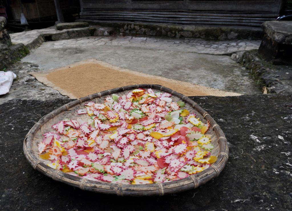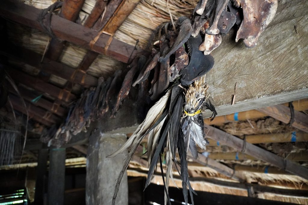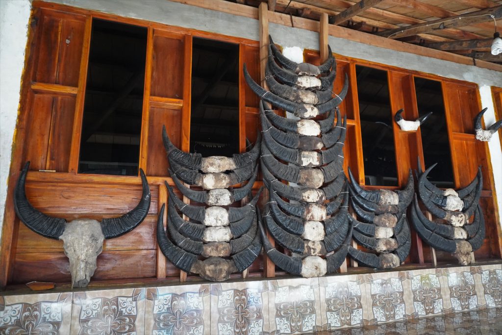 Most houses in this village had water buffalo skulls and/or horns displayed on them. When we went into one of the houses, they also had some inside, plus pig jawbones. The man there told us they were for the animals the family had sacrificed. I’m not sure what the sacrifice was for, but it seemed like sometimes it happened when someone died.