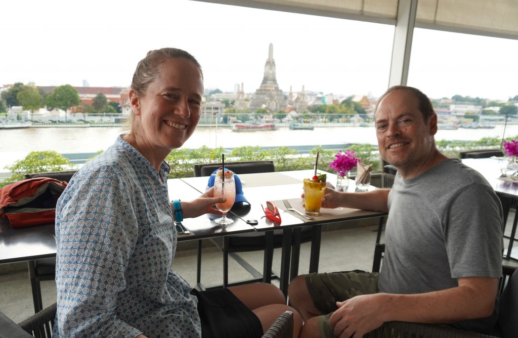 After Wat Pho we walked up past the Royal Palace complex but opted not to go in. We weren’t dressed fully appropriately, and we decided that we’d had enough of temples anyway. Instead, we had lunch at a lovely tiny restaurant along the river and then found a riverfront bar to duck into out of the rain. The view of the river and Wat Arun on the other side was beautiful.