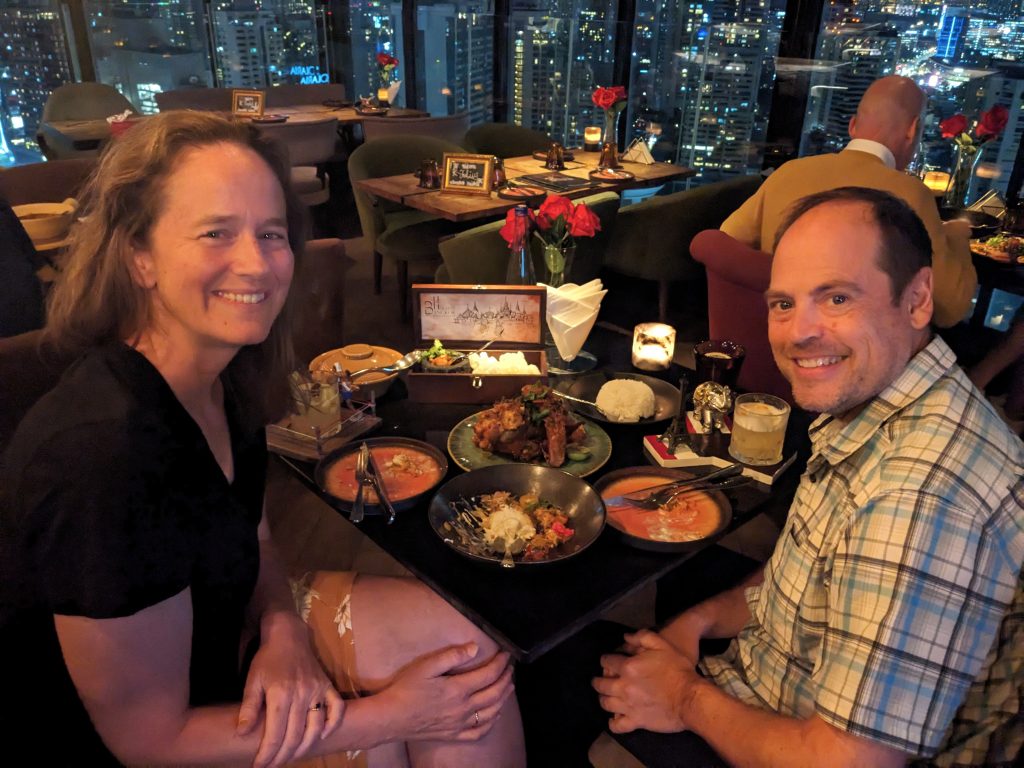For our last night in Bangkok we decided to eat a fancy dinner at The Continent’s rooftop restaurant. We’d read good things about it, and we figured we were staying there, so why not check it out? It was a fun night with delicious food. They do a take on Thai street food, and we ordered a number of small plates to try. So delicious! It was a great way to end our time in Thailand.