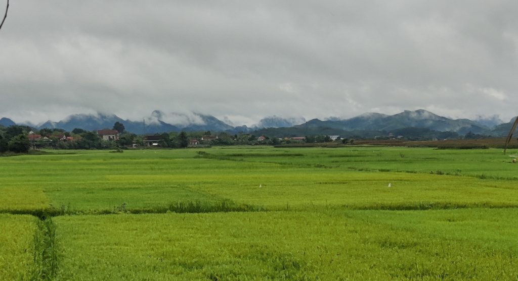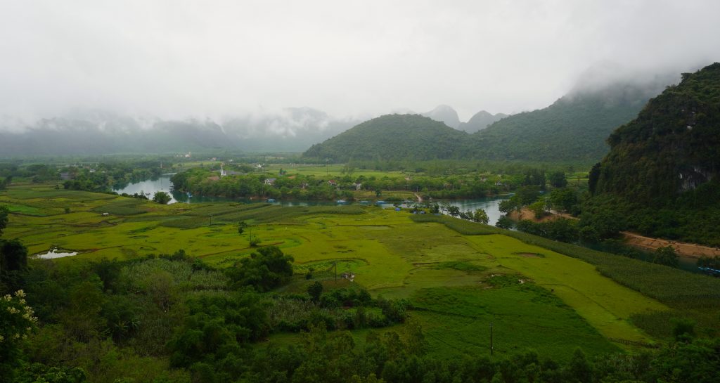 View of the rice paddies and limestone karst hills from Phong Nha Farmstay.