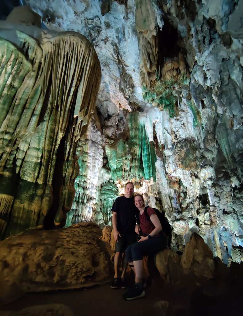 From Phong Nha’s main boat dock it’s easy to book a boat to take you to Phong Nha Cave. Each boat is owned by different families, so paying the small fee to have your own boat gives another family income for the day. Adam and I were happy to have our own boat to motor us the several kilometers to the cave. Before we headed into the cave by boat, we stopped so the two of us could hike up to the drier part of the cave located above the river. It ended up being a really cool, very private large cave to explore, but was a bit more of a hike than we expected! The fresh coconut water with a river view was much appreciated when we got back down to the dock.