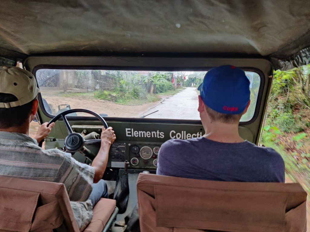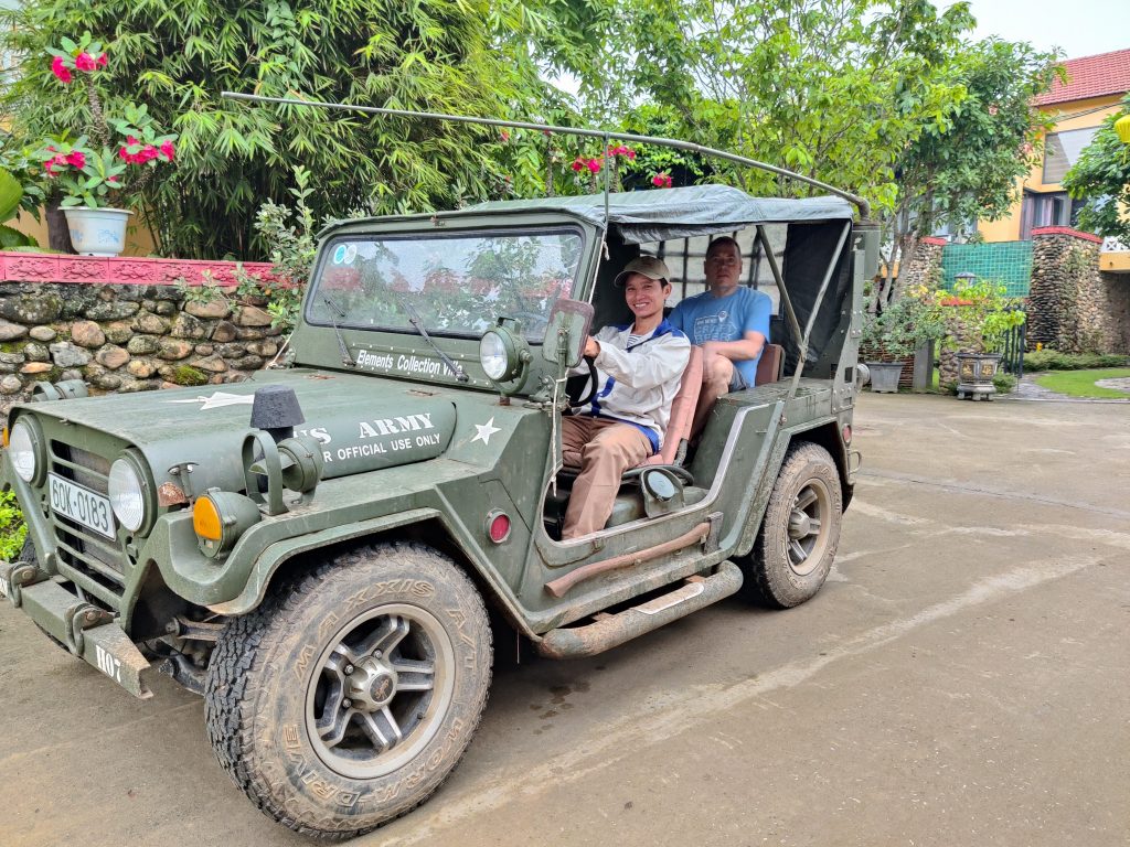 Riding in the old US Army Jeep at Phong Nha Farmstay.