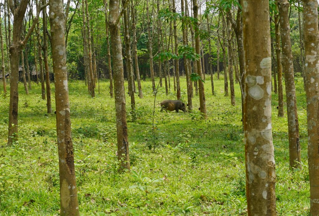 One of the pigs they raise free-range among the rubber trees at Monkey Bridge Farm